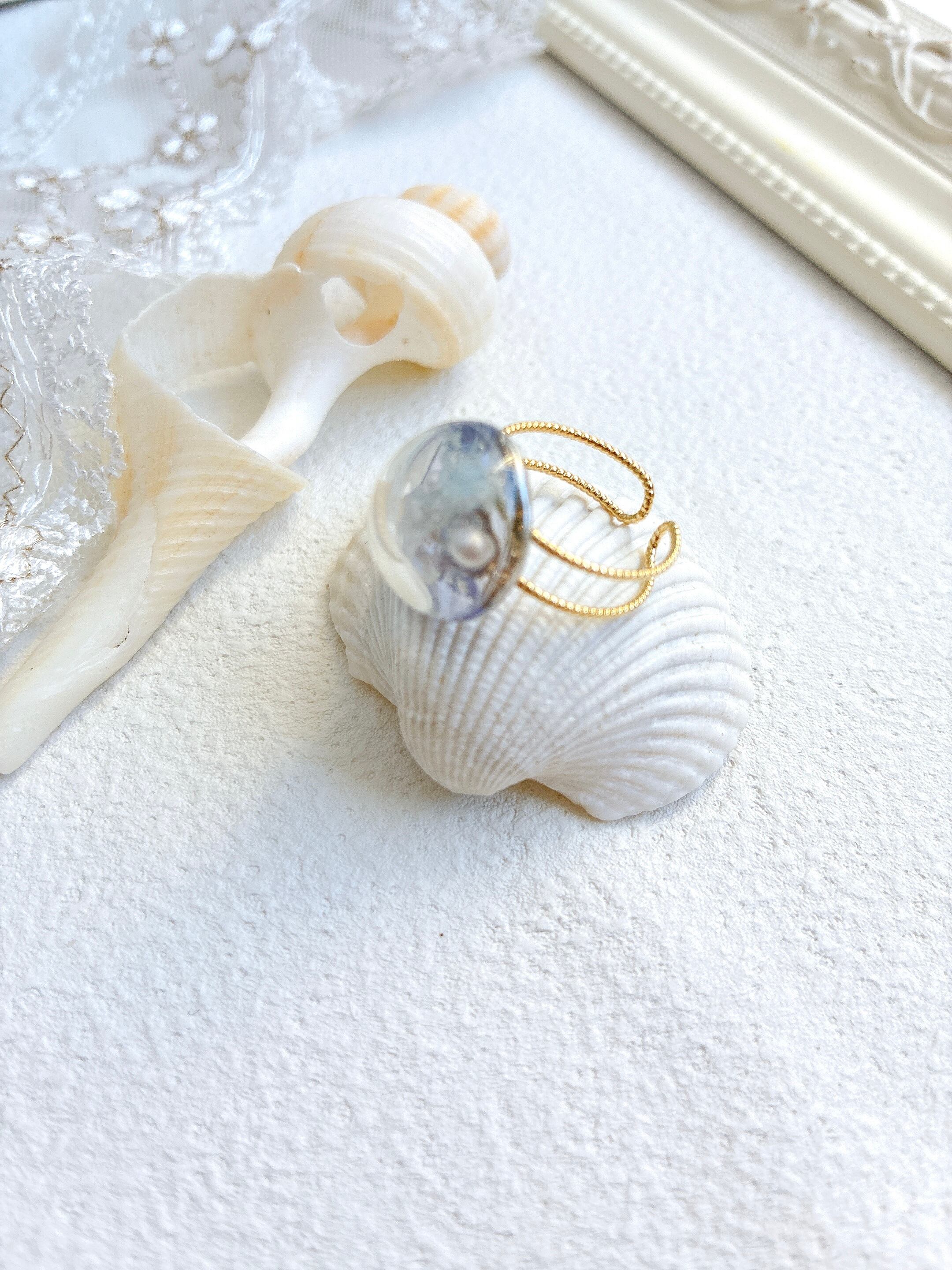 サークル型のレジンの中は空洞になっていて、クリスタルクォーツ(水晶)のルースや淡水パールが入っています。大ぶりですが、中が空洞の為、とても軽くて着けやすいです。